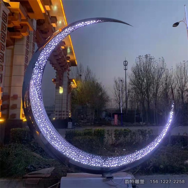 不锈钢圆环雕塑的每一寸都经过精心打磨,反射着周遭景物的光影。阳光下,它闪烁着耀眼而不刺目的光芒,为繁忙的都市生活增添了一抹宁静与和谐。不锈钢发光月亮雕塑宛如一颗从夜空中坠落的明珠,散发着柔和而神秘的光芒。