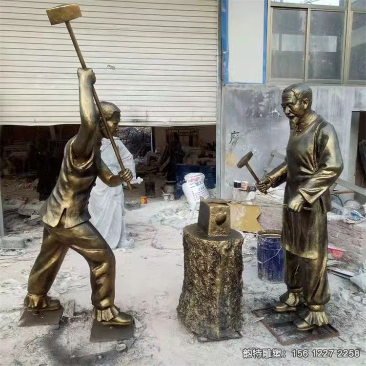 玻璃钢铁匠人物雕塑,重现了铁匠们开始工作一天的场景,他们熟练的操作着锤头和火炉,铁器在他们手中慢慢展示出想要的构造。这些场景好像定格在雕塑中,使人们感受到工匠的精神,他们知道怎样在火花中铸造理想,在锤击声中弘扬智慧,用毅力和恒心谱写人生的乐章。这座传统打铁匠雕塑背负着古代工匠的智慧和努力,我们可能已经忘记了古代铁匠这个,但通过这座雕塑,传统工匠精神永远不会过时,有着不屈不挠的品质和对工作的热爱之情。