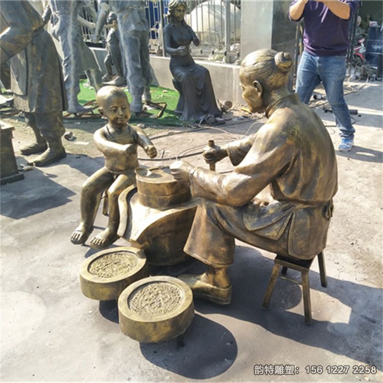 这种磨豆浆人物雕塑之美在于它所传达的文化内涵,它超越了物质的观感,是一种精神的升华和情感的表达。石磨在中国历史上起着重要作用,作为一种古老的研磨工具,在我国有着悠久的历史传统。古时候,中国人用石磨磨小麦、玉米等谷类,制做面粉和面食,为中华民族美食文化增添了独特的风味。石磨不但广泛用于农村,并且在城市中也有一定的地位,用来制作传统的点心和小吃。这组玻璃钢老婆婆推磨雕塑使我们珍惜这门古老的工艺,感受它所蕴含的美,让传统的民俗文化永远闪耀,照亮每个人心里的梦想。